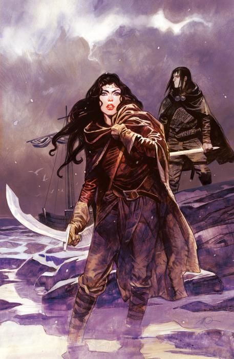 Cloonan returns for "Conan the Barbarian" #7 and it makes me more fond than ever of her art. Every character is drawn wonderfully here, and I'm not just talking about Conan and Bêlit. Conan's mother, for instance, might be an older woman but you almost instantly perceive her great strength and self-assured nature. Her stony expression when she first lays eyes on Conan and Bêlit is hard to meet for long and her glancing back over her shoulder to verbally crush Bêlit two panels later is expertly played. Cloonan tackles the scenery well, too; everything from snowy landscapes to a burning countryside as barbarians attack. As much as I like artist Vasilis Lolos (who takes over next month), there's no denying the high value of having art like Cloonan's on "Conan the Barbarian." She's able to sell just about every scene here perfectly.