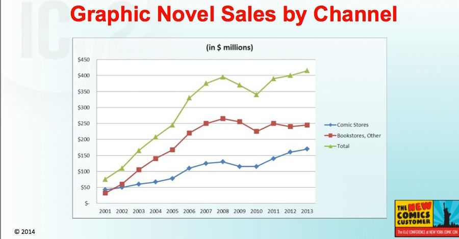 Sales of graphic novels have grown steadily in comics shops but have been flatter in bookstores over the past few years. On the other hand, there are 600 fewer bookstores now than before Borders closed its doors in 2011. "The fact that the book channel has held on as well as it has despite the loss of so many doors, and such a big percentage of the doors, I think is actually a pretty positive sign," Griepp said, noting that with flat sales and fewer stores, dollar sales per store are going up.